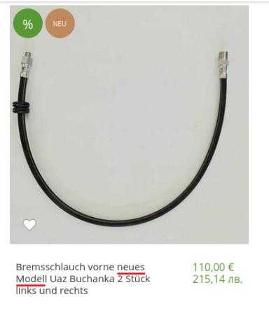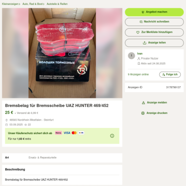 Zu Ivan's Preisvorstellungen komme ich später noch. Wir sehen, dass es sich wohl um irgendeine fernöstliche Keramikmischung handeln soll, die mit ziemlicher Sicherheit auf der Standardstahlbremsscheibe nix zu suchen haben dürfte. Zum anderen dürfen diese Bremsbeläge im europäischen Verkehrsraum wegen der fehlenden Zulassung (e22) gar nicht montiert werden. Das bedeutet, die Betriebserlaubnis vom UAZ erlischt und zwar so lange, wie die Bremsklötze montiert sind - Tatsache. Es macht sich bitte jeder selbst Gedanken, wieviel von Bremsbelägen zu halten ist, die fast die Hälfte billiger sind, als die originalen und umgerechnet gerade 10,- € kosten (und auf Kleinanzeigen für 25,- zzgl. Versand verkauft werden sollen).