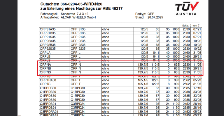 Sowie die noch viel wichtigere Bescheinigung des Herstellers über die Felgentraglasten: