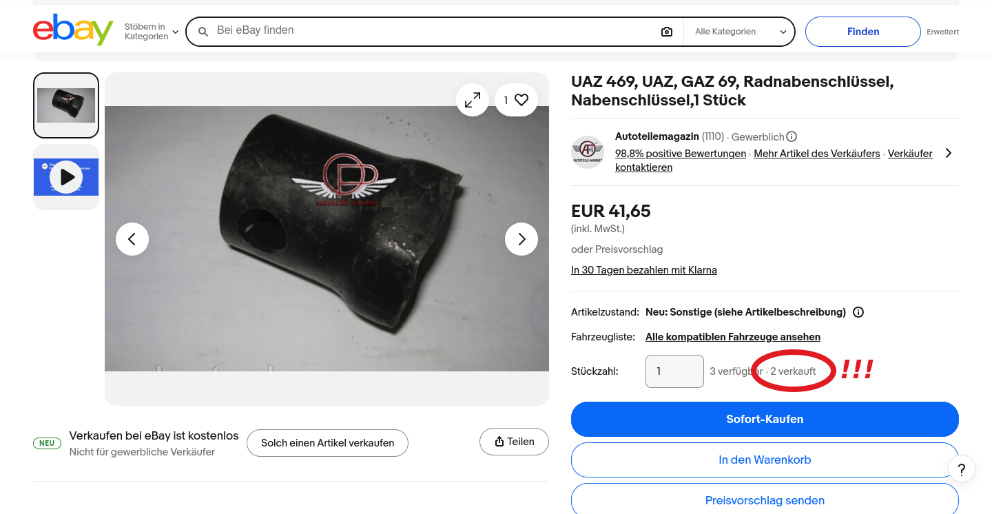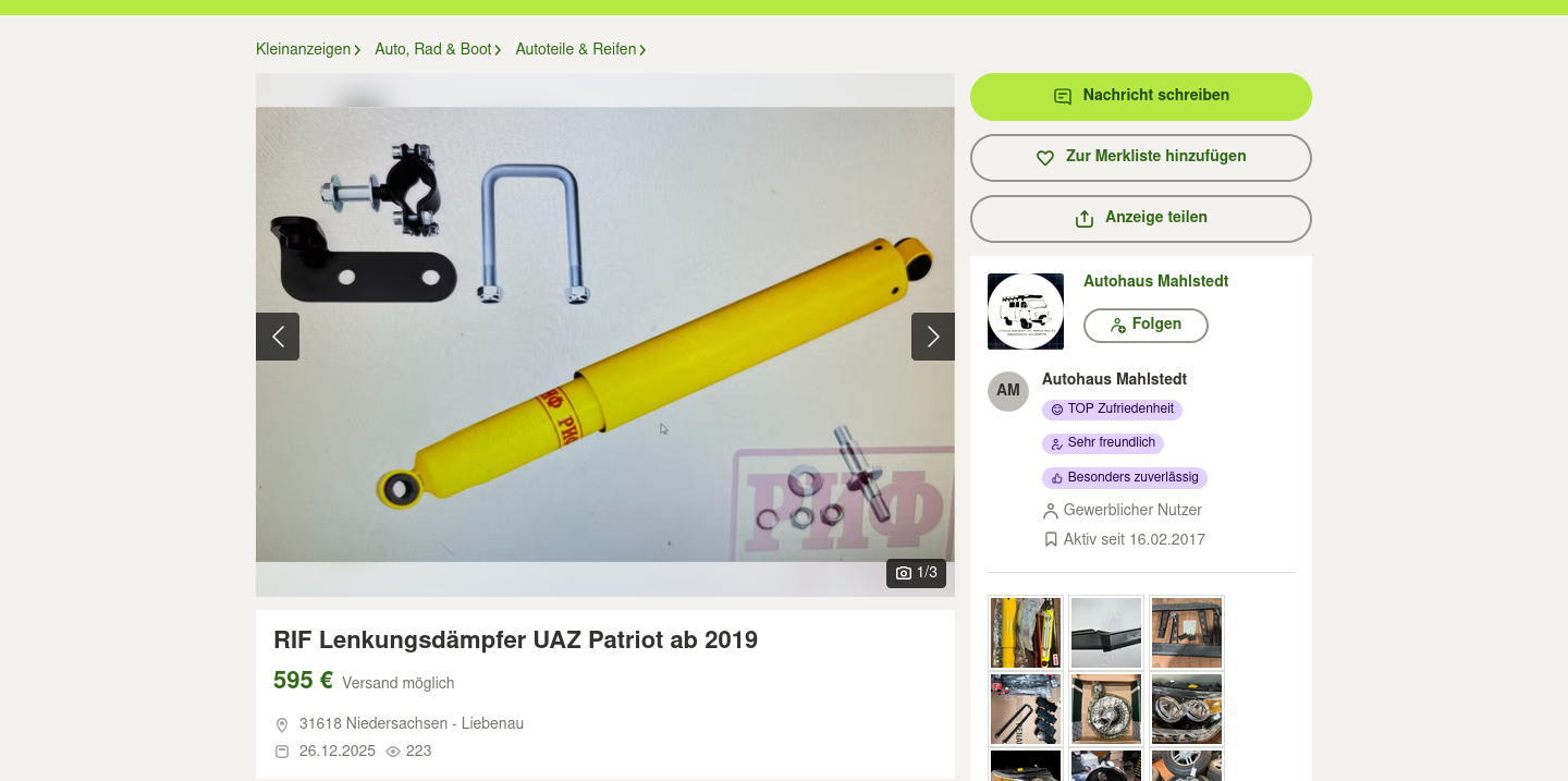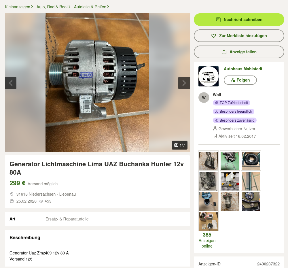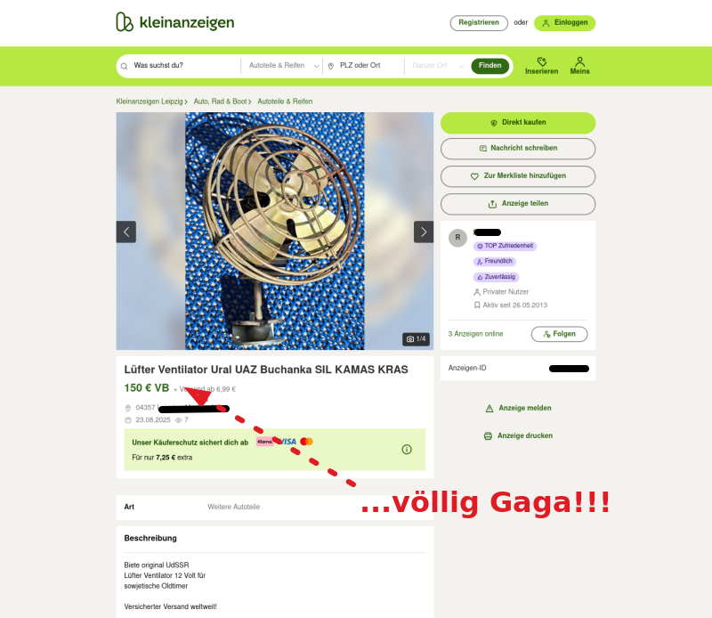 Ich erwarte nicht, dass die "UAZ-Leute" anders drauf wären, als der Rest. Die Bitte nach einem Bild als Vorwurf an den Käufer zu verdrehen, dass man den Kaufgegenstand bevor man unnötige Abhol-Kilometer fährt, wenistens mal komplett auf einem Foto gesehen hat, ist schon ziemlich dummdreist und frech. Das ist exakt die selbe Nummer, wie oben drüber mit den Versandkosten und der allgemeinen Preispolitik bei UAZ-Teilen. Wir müssen uns in dieser Gesellschaft über nichts wundern, über gar nichts!
