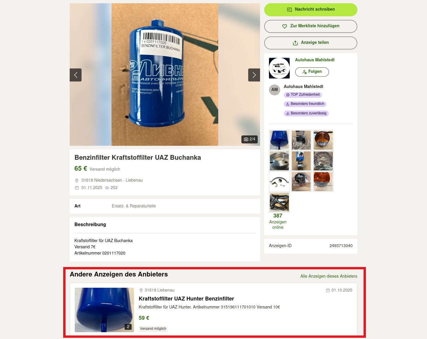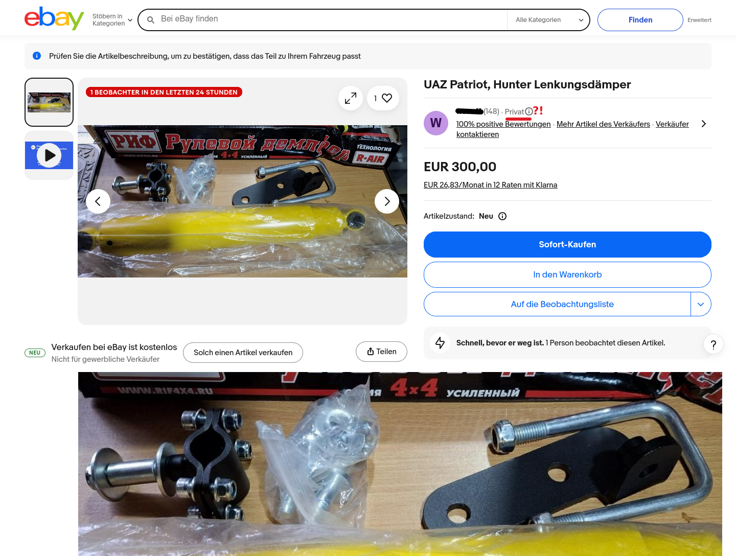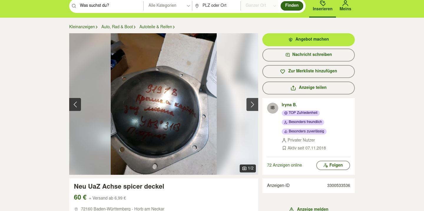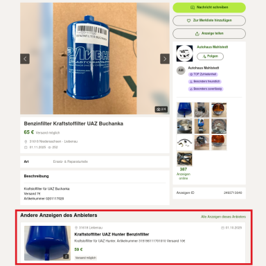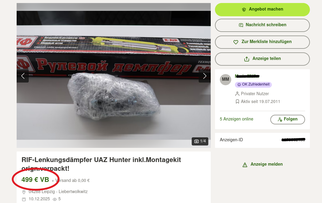 Ich erwarte nicht, dass die "UAZ-Leute" anders drauf wären, als der Rest. Die Bitte nach einem Bild als Vorwurf an den Käufer zu verdrehen, dass man den Kaufgegenstand bevor man unnötige Abhol-Kilometer fährt, wenistens mal komplett auf einem Foto gesehen hat, ist schon ziemlich dummdreist und frech. Das ist exakt die selbe Nummer, wie oben drüber mit den Versandkosten und der allgemeinen Preispolitik bei UAZ-Teilen. Wir müssen uns in dieser Gesellschaft über nichts wundern, über gar nichts!