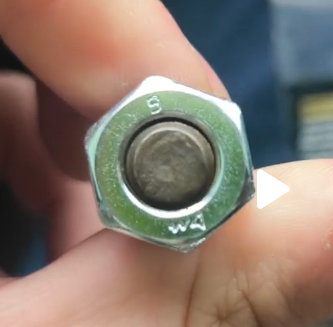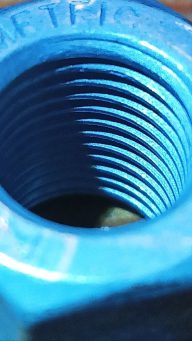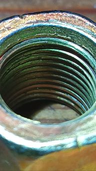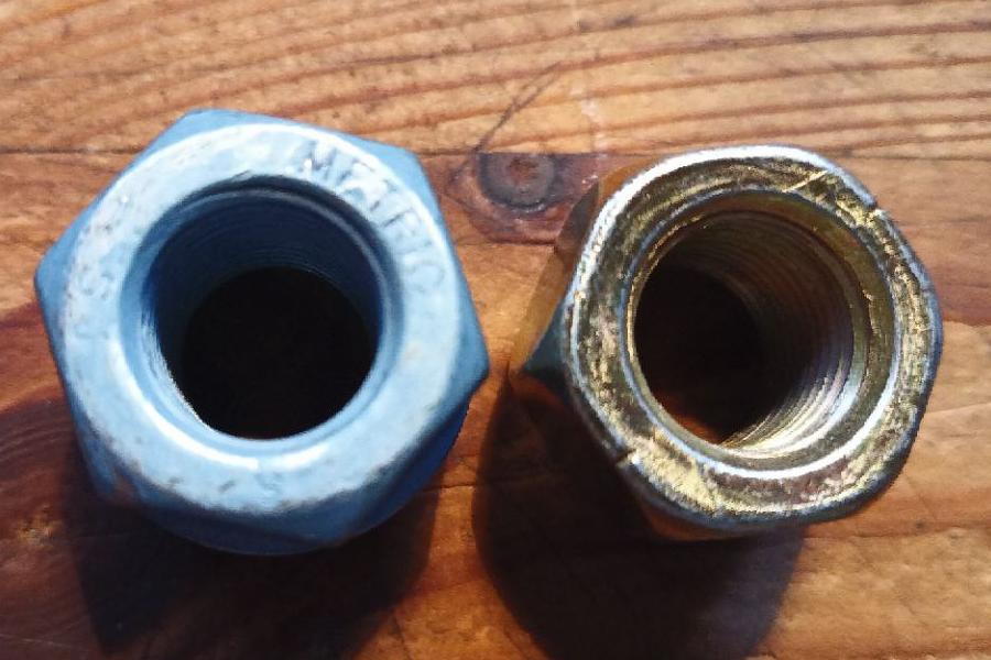 Links febi, rechts original und in Summe fast 2,5mm Höhenunterschied der Mutter. Das sind auch fast 2,5mm mehr Gewinde. Genau genommen ist das mindestens ein kompletter Gewindegang mehr. Nachzählen könnt Ihr selbst. Was fällt noch auf? Richtig, die febi-Mutter ist mit "SJ" für den vermutlich taiwanesischen Hersteller SJ.Screw, "METRIC" und der "9" für die Festigkeitsklasse gekennzeichnet. Auf der vermutlich russischen Mutter ist gar nix zu finden.