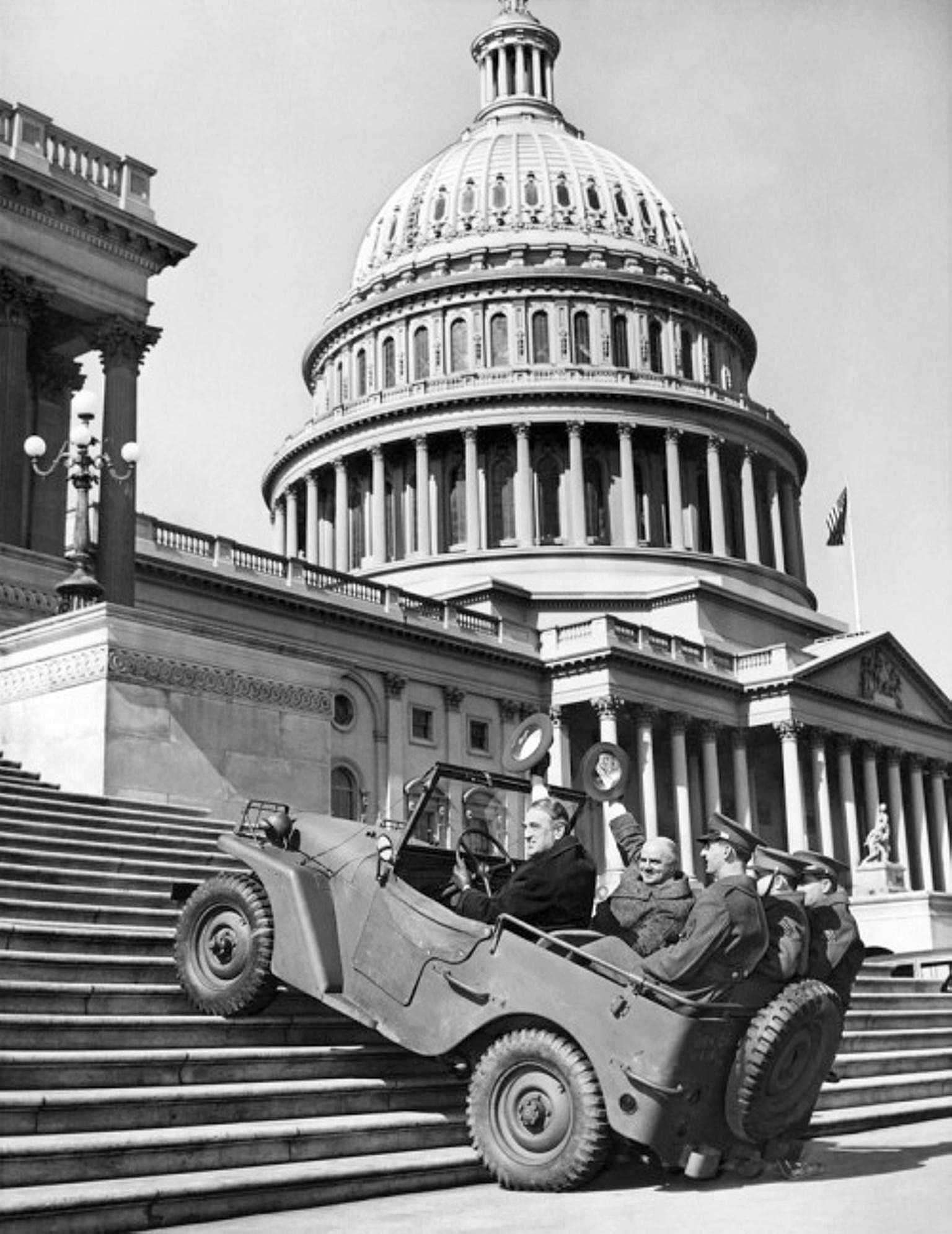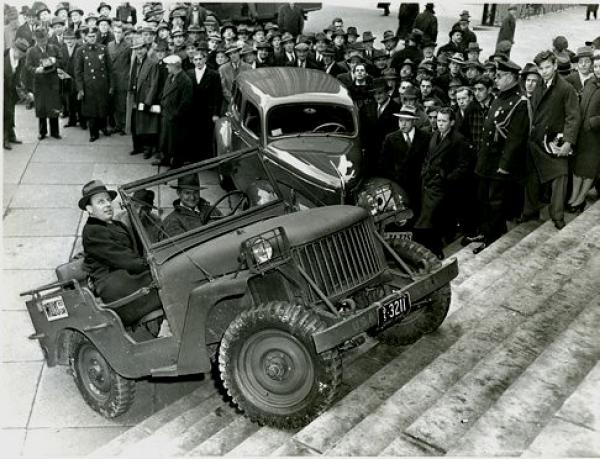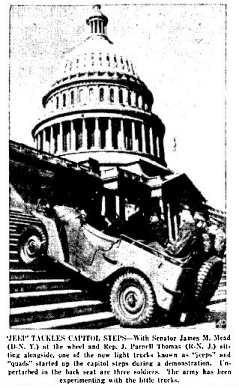 Unter diesem berühmten Foto von der Wisconsin Rapids Daily Tribune vom 20. Februar 1941, bemerkte man in einer Bildunterschrift, dass die neuen Fahrzeuge der als Jeeps oder Quads bekannt wären (es ist hinlänglich dokumentiert, dass es im Land der Unmöglichkeiten einen langen Streit um die Namensrechte gab). Selbst die Storry mit dem Willys-Cheftestfahrer erscheint irgendwie nachträglich inszeniert.