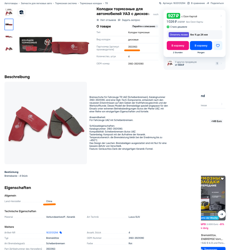 Zu Ivan's Preisvorstellungen komme ich später noch. Wir sehen, dass es sich wohl um irgendeine fernöstliche Keramikmischung handeln soll, die mit ziemlicher Sicherheit auf der Standardstahlbremsscheibe nix zu suchen haben dürfte. Zum anderen dürfen diese Bremsbeläge im europäischen Verkehrsraum wegen der fehlenden Zulassung (e22) gar nicht montiert werden. Das bedeutet, die Betriebserlaubnis vom UAZ erlischt und zwar so lange, wie die Bremsklötze montiert sind - Tatsache. Es macht sich bitte jeder selbst Gedanken, wieviel von Bremsbelägen zu halten ist, die fast die Hälfte billiger sind, als die originalen und umgerechnet gerade 10,- € kosten (und auf Kleinanzeigen für 25,- zzgl. Versand verkauft werden sollen).