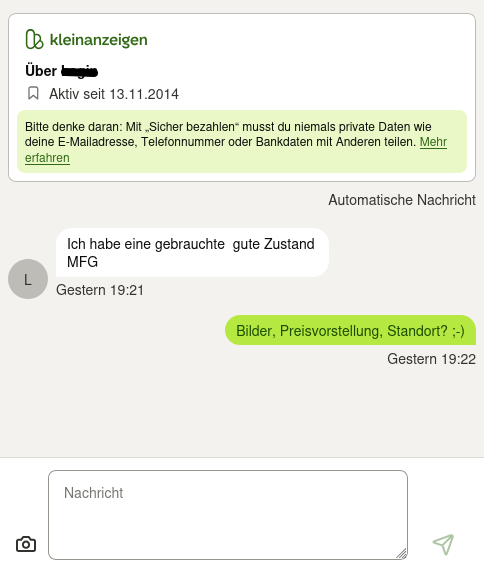 Das beste sind jedoch diese Spezi's, die es nach fast 12 Jahren "Teilnahme" am Konzept Kleinanzeigen noch immer nicht gerafft haben, ein Bild, ihre Preisvorstellung und den Standort ihres "Angebotes" ungefragt mitzuliefern und in der Minute nach Ihrem dahergeworfenen Informationbrocken in der digitalen Versenkung verschwinden. ^^