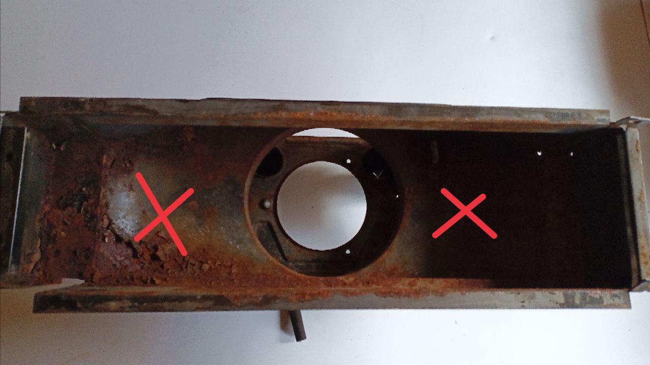 ante, die anstelle des Aschekastens und der unteren Wölbung mit dem runden Lüfterausschnitt am Rahmen des Wärmetauschers befestigt wird. Solch Kasten kann man in Russland fix und fertig für umgerechnet ca. 110,- € zzgl. Versand kaufen.